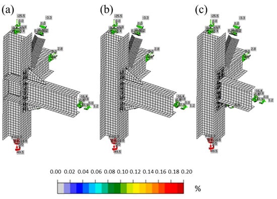 Strains computed on the connection for the three 8ES EPC models: (a) CP-DP-ST, (b) ST, and (c) NP.