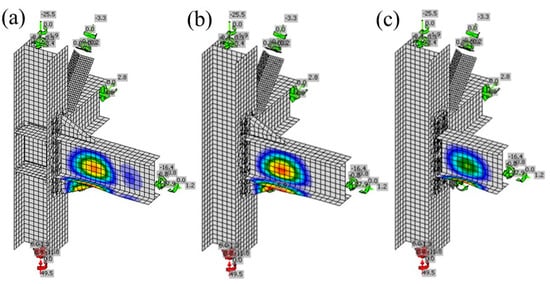 The first model consists of the design of the connection resulting from the spreadsheet, which includes continuity plates and doubler plate reinforcement, as outlined in Figure 3. Details of this resulting pre-qualified connection can be seen in Figure 4, in which the bracing was purposely omitted so that the details of the connection could be correctly appreciated. The second model consists of the connection resulting from the design but without doubler plate reinforcement, as shown in Figure 5a. The third model consists of the connection resulting from the design but without incorporating continuity plates, as presented in Figure 5b. The fourth model consists of the connection resulting from the design but without the inclusion of continuity plates as doubler plate reinforcement, as depicted in Figure 5c.