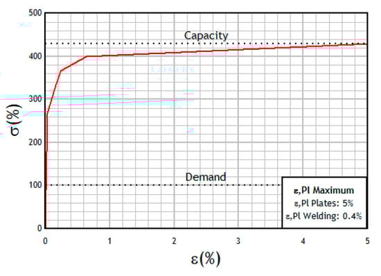 When contrasting the percentage load vs. deformation, if the first four models show practically identical results, then one of them can represent the performance of any of the other three models. This contrast could be observed in Figure 8 and Figure 9. Then, the first models’ results achieved the same value of 366.70% of the design load as the yield strength. Therefore, it is possible that there is a design load far below the plastic range for the main models studied. Likewise, when focusing on the ultimate capacity, which corresponds to a value of 428.40%, the result indicates that this is 4.28 times greater than the design load. For this reason, it is assumed that these EPC configurations could perfectly withstand higher load demands, still exceeding the linear range, until they reach reasonable ductility values without compromising the safety of the structure.