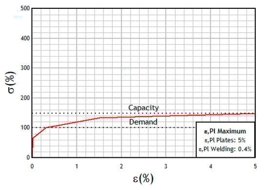 Regarding the DR type analysis, 100% of the load combinations were applied. Part of its results are presented graphically, relating percentage load vs. percentage strain for the most critical combination of loads for each model, as shown in Figure 9 and Figure 10. The maximum percentage values obtained for plate and weld strain are included in the graphs.