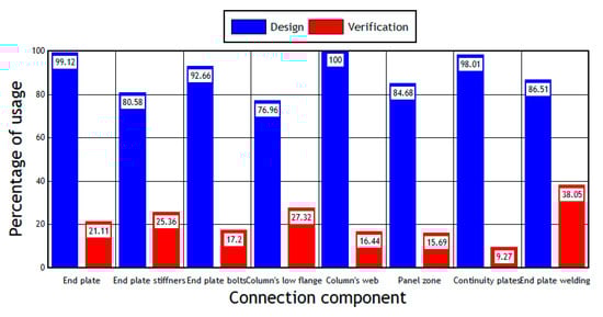 The panel area, which is not affected by large stresses, does not experience large deformations, and therefore, its great flexibility, of which it is characterized, is not put into play [5]. Another aspect that should be reviewed is the apparent lack in the development of a plastic rotation in the beam since there is only a slight increase in forces in the connection of the end-plate stiffeners to the beam flange, at the end, furthest from the end plate (see Figure 8). This scenario does not promote the appearance of plastic deformations in the panel area [4]. Regarding the nonlinear analysis results, the continuity plates lead in the group of elements with the lowest values at 9.27%. According to this and the column web results, they can be taken as clues to confirm how dispensable the addition of column stiffeners [22] can be. In contrast, welds from end-plate stiffeners to beam flanges are the most required components in the connection, with a 38.05% weld utilization ratio (). Consequently, these welds are also integral to the group of elements that absorb the most energy in the EPC, followed by the column flange in second place, end-plate stiffeners in third, and end plate in fourth place. The reason for this is that the design formulated by AISC 358 reinforces its restrictive and conservative requirements by exhibiting such high levels of , which are not equal to those achieved by using nonlinear analysis. Hence, this approach leads to an oversized design for what is practically needed and, therefore, with high structural redundancy [40].
