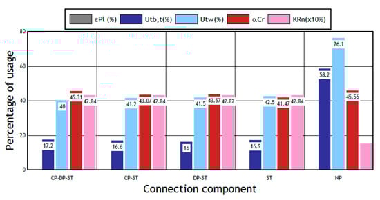 For , as reinforcing plates in the first three models are deleted, they gradually decrease in value. Such behavior is explained through the elimination of elements with respect to the energy distribution. However, this behavior change in the ST model with a slight rise can be explained based on the decrease in the column stiffness and beam rotation. Regarding the possibility of developing prying loads, their formation is discarded for all the remaining models, even for the NP model, which had the highest value of 58.20%, due to the almost zero yielding that happened in all of them. It should be noted that the limit value of the utility is 100%. Therefore, it is estimated that it is still possible to achieve a better degree of optimization for the bolts either by reducing (a) their diameter; (b) the steel grade; or (c) their location on the end plate or (d) by simply changing the type of EPC to one with a smaller number of bolts, according to the load requirements to which this connection is affected.