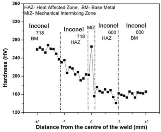 - The dissimilar weld was characterized by a narrow mechanical intermixing zone at the interface. In this zone, severe plastic deformation at high temperatures resulted in dynamic recrystallization leading to very fine equiaxed grains. Consequently, this zone displayed significantly higher hardness.