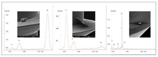 Surface contamination of the machined OMIs. From left to right: aluminum particle (Al), carbon particle (C), and plastic particle (Polyvinyl Chloride PVC).