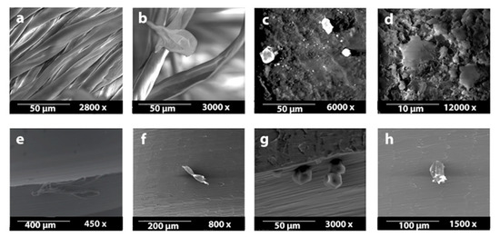 (a–d): Handling materials seen under SEM (first line) and (e–h): remaining particles on the touched OMIs respectively (second line). From left to right: (a,e): sterile gauze soaked in chlorhexidine, (b,f): dry sterile gauze, (c,g): nitrile glove, (d,h): latex glove.
