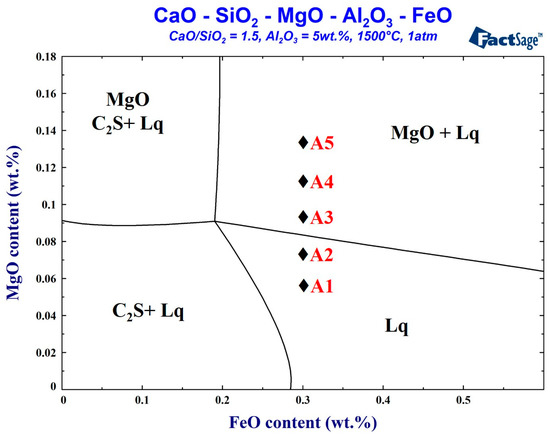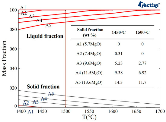 In this study, the FactSage software was used to simulate the solid phase fraction of the different samples (A1–A5) at 1500 °C (Figure 3). It can be seen that A1 and A2 are liquid at 1500 °C. It was observed that the fraction of the solid phase increased (in A3, A4, and A5) when the amount of magnesium oxide in the slag was increased at a temperature of 1500 °C. When the magnesium oxide content increased from 9.6 wt.% to 13.6 wt.%, the fraction of the solid phase increased from 2.77 wt.% to 11.7 wt.%.