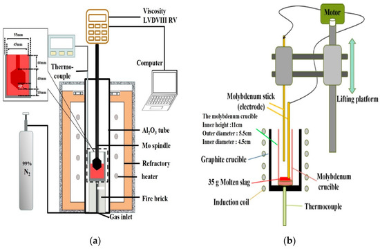 The Brookfield LVDVIII RV (AMETEK Brookfield, Middleboro MA, USA), equipped with a high-temperature furnace system with a maximum temperature limit of 1640 °C. Thermocouples were used in Pt-10%Rh/Pt monitoring instruments, as shown in Figure 2a, and the system was used for the experiments. Before the viscosity measurement, standard silicone oil samples with the viscosity of 0.0986, 0.476, and 0.973 Pa·s were used to calibrate the spindle at room temperature. When starting the experiment, the temperature increased in two stages: Initially, the rate of increase was 10 °C/min (from room temperature to 1300 °C). The rate of increase was 2 °C/min (from 1300 °C to 1640 °C) in the next stage. The sample (140 g) was placed in a molybdenum crucible. When the slag temperature rose and the viscosity reached the test range of the instrument, the molybdenum rotor was gradually lowered to a distance of 10 mm from the bottom. The rotation speed was set to 20 rpm, and continued heating while measuring the viscosity. In order to avoid the oxidation of Mo crucible and Mo spindle, and to prevent changes in the iron oxide content, the nitrogen gas (99.0%) was used at a flow rate of 0.5 NL/min. Viscosity data are a continuous curve that changes with temperature. In order to confirm the reproducibility of viscosity measurements, this study repeats the experiment for slags A3 and A5, and take the average data at each temperature.