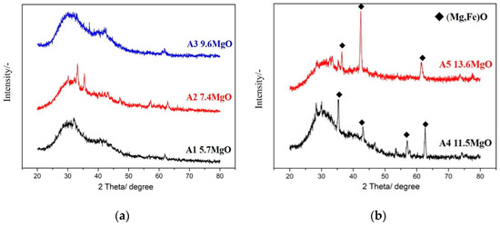 The five samples of foaming slags simulated and designed by the FactSage software were melted and transformed into their liquid states using a high-frequency furnace. Following this, the molten slags were removed from the furnace and rapidly quenched by water to produce the glass phase of the samples. XRD (Bruker, Billerica, MA, USA) analysis revealed the amorphous nature of the glass phase of the samples (Figure 4a). A1 and A2 are liquid slags, and A3 has very little solid phase fraction, so there is no obvious solid phase peak in the XRD pattern. Thus, the XRD analyses confirm the amorphous state of the samples. Figure 4b shows the XRD patterns of A4 and A5. As the A4 and A5 samples contain more amounts of the solid fractions, the XRD profiles exhibit peaks corresponding to (Mg,Fe)O.