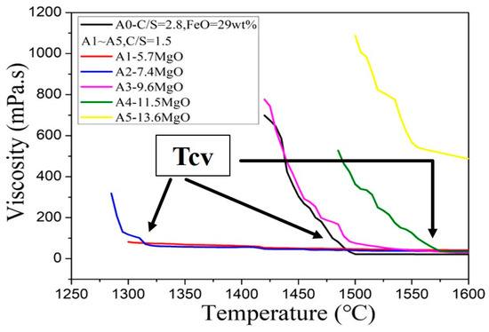 Figure 5 shows that, as the temperature increases, the slope of the viscosity curve changes from a negative value to approach zero. This can be explained by the solid phase in slag disappears and transforms into a fully liquid slag. At low temperatures, solid and liquid states coexist in the slag. The dominant viscosity mechanism is the solidification phase fraction. However, as the temperature increases, the fraction of the solidified phase decreases until the slag is completely converted to its liquid state. The bonding strength dictates the viscosity in the liquid phase. The profiles of the two different viscosity mechanisms exhibit different slopes. As the temperature transition occurs, the mechanism of temperature transition is defined by the “critical viscosity temperature” (Tcv), which is the viscosity turning point in Figure 5. When the temperature is higher than this temperature, the liquidus temperature is reached. The viscosity at a specific temperature (in the A0–A5 samples) and the Tcv of each sample are presented in Table 2. It can be seen from Table 2 that only A0, A2, A3, and A4 exhibit Tcv. This is because the Tcv of A1 is lower than 1280 °C, which is significantly lower than the minimum measurement temperature during viscosity measurement (1300 °C). The addition of excess amounts of magnesium oxide (MgO) (13.6 wt.%) results in the failure of A5 to reach Tcv even at a temperature of 1600 °C.