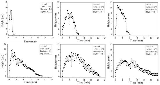 At 1500 °C, A0, A1, and A2 form liquid slags, and A3, A4, and A5 form slags where solids and liquids coexist (Figure 6). The foaming slag used in steel plants A0 exhibits a foaming life of approximately 2 min. The foaming lives of A1 and A2 are 7.7 min and 6.2 min, respectively. The silicon oxide content in A1 and A2 is approximately 23 wt.%, while the slag A0 is the 1.5CaO/SiO2-30FeO-xMgO-5Al2O3 slag system, which exhibits a more complex network structure than the slag A0 used in steel plants, contains approximately 16 wt.% of silicon oxide. Therefore, it is speculated that A1 and A2 contain more amounts of Si-O-Si network bonds. This increases the time of stay of the bubbles in the slag, improving the foaming efficiency.
