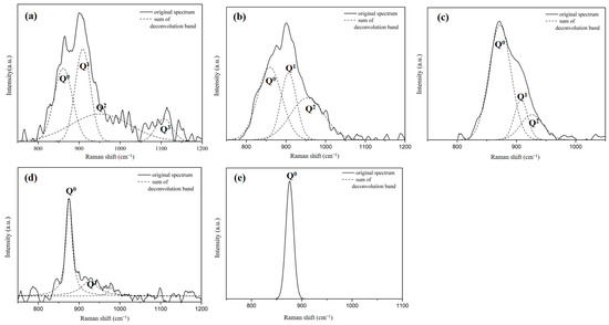 The analysis of the Raman spectral profiles of each sample is conducted according to the Qn Raman shift values presented in Table 3 [14,15,16,17,18]. The results are plotted, as shown in Figure 7. The fitting values (R2) of each of the component peaks are all greater than 0.91. The solid line represents the Raman spectrum, and the dotted lines are obtained by splitting the detected peaks. Different Si-O-Si bonding types are detected based on the component peaks, and the ratio of the areas between the various peaks is calculated.