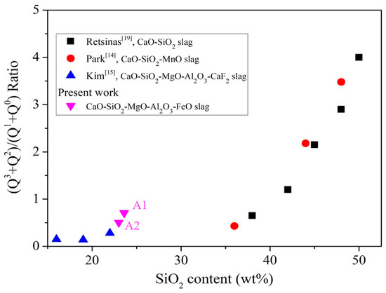 Influence of SiO2 content on Q2 + Q3 / Q0 + Q1 of liquid slag [14,15,19].