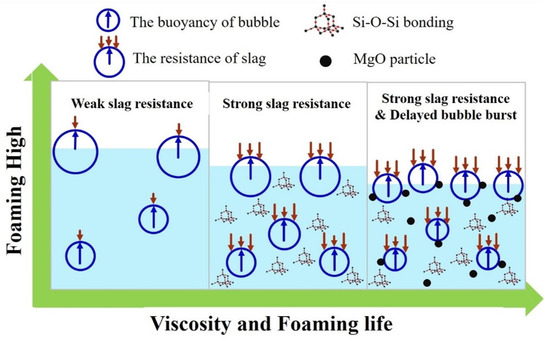 The proposed foaming mechanism is shown in Figure 10. When the slag is completely in the liquid state, better fluidity and lower viscosity are observed. Therefore, when the CO gas is generated, relatively less resistance is generated. This leads to the generation of a higher foaming height. It becomes easier for the gas to remove liquid slag and return to the upper gaseous layer. Thus, the shortest foaming life was observed. When gas is generated, the bubbles reach the surface faster due to low silica network bonding and viscosity, but, when bubbles reach the highest peak, the rising speed of the bubbles is consistent with the bursting speed of the surface layer, and the height is no longer raised. The viscosity increases as the silica network structure increases, which will cause the rising speed of bubbles to slow down. On the other hand, the burst speed of top layer foam is unaffected by viscosity. In general, the increase in the silica network structure slows down the rising speed of the bubbles while the bursting speed remains un-changed, resulting in a drop in the height of the bubbles, and longer foaming life is observed. The dual effect of the solid phase particle precipitation and liquid slag bonding results in the gradual flotation of the body. The bubble causes heterogeneous nuclea-tion, leading to a long burst time. Thus, the longest foaming life is achieved.