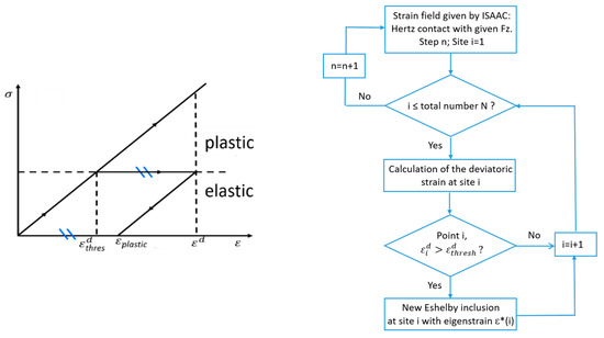 The implementation of the model is the following. The first two materials of Hertzian geometry are put in contact with a vertical load Fz giving rise to a spherical contact area with a radius (see Section 2.3). Starting from this initial configuration, a threshold εdthresh is chosen as detailed later. If the maximum local deviatoric strain becomes larger than εdthresh, then an Eshelby inclusion is nucleated at this place. εdthresh is random with