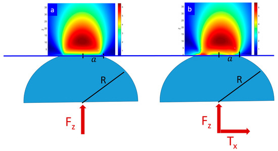(a): Hertzian contact and resulting deviatoric strain field inside the flat body compared to the same configuration (b): but with a friction coefficient µ = 0.3 at the interface between the two bodies and with a tangential load Tx = 0.24 Fz.