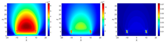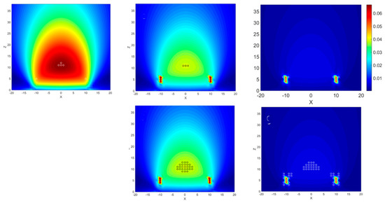 Deviatoric strain in the flat solid with two inclusions located very close to the surface. The shear eigenstrain supported by the inclusions is (from left to right): .