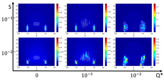 Effect of S and Q*, parameters characterizing the eigenstrain ε* of the nucleated events Equation (2), on the localization of plastic rearrangements at the 25th step of deformation with 10 events at each step, for Q = 0 (no disorder in the local thresholds) and initial defects . With our choice of loading Fz, the maximum deviatoric strain due to Hertz contact in the absence of disorder is equal to 0.65 × 10−2 here.