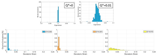 Let’s look now at the effect of the disorder through the parameter Q*. In Figure 6, the distribution of deviatoric strains in the sample is shown for different values of Q*. Increasing Q* not only contributes to enlarging the distribution of deviatoric strains as compared to the disorder-free Hertz case, but it can even give rise to very large cumulated deviatoric strains, up to 10% strain for Q* = 0.01 at the 25th step (Figure 6 bottom). Let us remind that Q* = 0.01 corresponds to a Gaussian distribution of eigenstrains with variance Q* = 1%, owing in our case at the 25th step extreme eigenstrains of about 3.5% only (Figure 6 top). In Figure 5, increasing Q* up to the 1% strain clearly contributes to counterbalance the role of the Hertz fields and of their spatial gradients. The plastic rearrangements localize close to the pre-existing defects. The resulting shear aligns along large shear bands, propagating straightly from the surface defects. While the role of defects is clearly enhanced in this case, it does not gives rise to curved shear bands, but only to straight bands initiated from the surface, even after a large number of events.