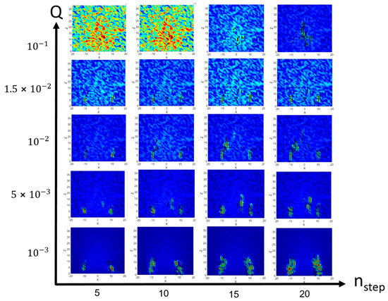 Effect of Q characterizing the disorder in the yield strain from Equation (1), on the localization of plastic rearrangements, for different number of steps, with Q* = 0.01 and S = 0.100 and initial defects with . With our choice of loading Fz, the maximum deviatoric strain due to Hertz contact in the absence of disorder is equal to 0.65 × 10−2 here.