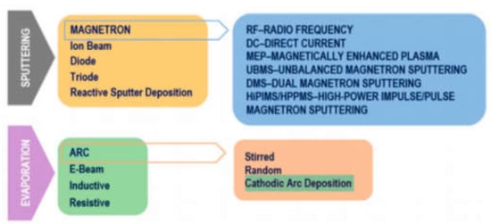 As previously mentioned, the PVD process involves various methods for the deposition of coatings. These methods influence not only coating composition, but their properties as well. These methods are primarily divided into two groups: sputtering and evaporation. All these methods can be observed in Figure 1.