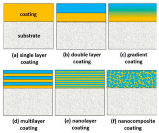 Regarding coating characterization as it was previously mentioned, coatings can be designed in order to fit a certain application, by controlling its architecture and composition, and thus, its microstructure and mechanical properties. There are various different coating designs applied to substrates for a wide range of applications. These can be observed in Figure 2.