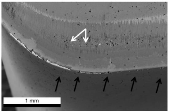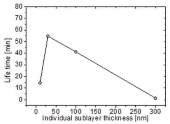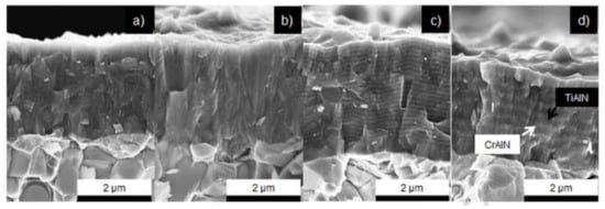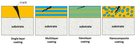 Different types of coating structure are chosen to deal with different kinds of problems, for example, the use of a multilayer coating can improve significantly upon the properties of the single layer coated tool. For example, a multilayered coating has significantly more crack propagation resistance than a single layered coating. The number of layers contributes to this, furthermore, an increase in the number of layers will also increase properties such as hardness [24,52,53]. A scheme of how crack propagation usually behaves depending on coating structure can be observed in Figure 3.