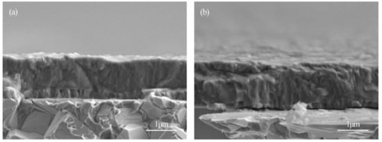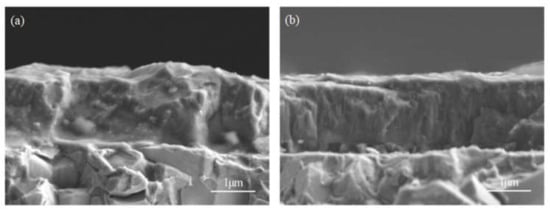 SEM cross-section of the TiAlMoN films with differing Mo contents: 8.3 at. % (a); 10.1 at. % (b), presented by Yang et al. [59].