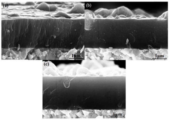 SEM cross-sectional image of TiAlN coatings with different Ruthenium contents: 0% (a), 7% (b), 15% (c), presented in the study carried out by Liu et al. [62].
