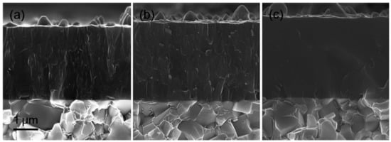 The addition of Nickel to TiAlN-based coatings is also an interesting topic. Similar to Mo, the addition of Ni to coatings also has an influence on the microstructure, as reported by Yi et al. [61] in their study, where three samples of AlTiN-Ni with differing contents of Ni are analyzed and subsequently tested in the turning of Inconel 718. The analyzed AlTiN-Ni coatings had 0%, 1.5% and 3% Ni. The AlTiN-Ni coatings were obtained via PVD cathodic arc evaporation. Figure 7 shows the three cross-sectional images of the coatings.