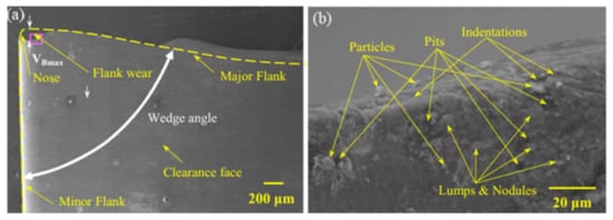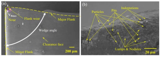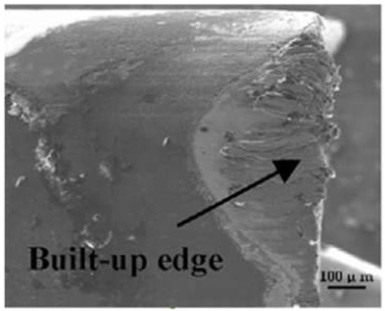 The presented coatings both exhibit the same type of wear mechanisms, these being built-up edge (BUE), pitting and coating delamination. From the figures it can be noted that adhesion is also a problem, this last mechanism being responsible for BUE and coating delamination. These wear mechanisms, as in milling, are characteristic of machining hard-to-machine materials such as Inconel, due to material’s mechanical properties. Still regarding TiAlN coating’s performance when turning Inconel, the study performed by Kurniawan et al. [79] evaluates the machinability of modified Inconel 713C, using a TiAlN-coated WC tool. The cutting characteristics of Inconel 713C are very similar to those of Inconel 718, making it a very hard to machine material. The authors have reported abrasive wear as the main wear mechanism in the tool’s flank, being followed either by tool failure or BUE (Build up Edge) formation, as can be observed in Figure 18. High machining temperatures and the ductility of Inconel 713C, caused material adhesion to the tool, which promoted abrasive wear and subsequent coating delamination.