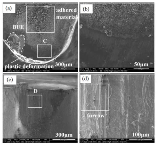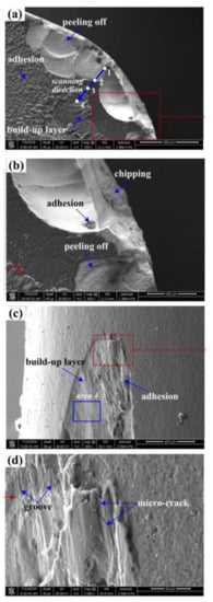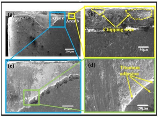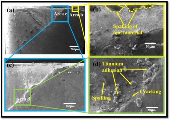 Wear patterns exhibited by Coating 2 after machining: SEM image of flank face (a); magnification of area b (b); magnification of area c (c); magnification of area d (d). Presented by Hou et al. [72].