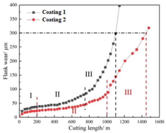 Flank wear measurements (µm) for various cutting lengths, for both coatings, presented by Hou et al. [72].