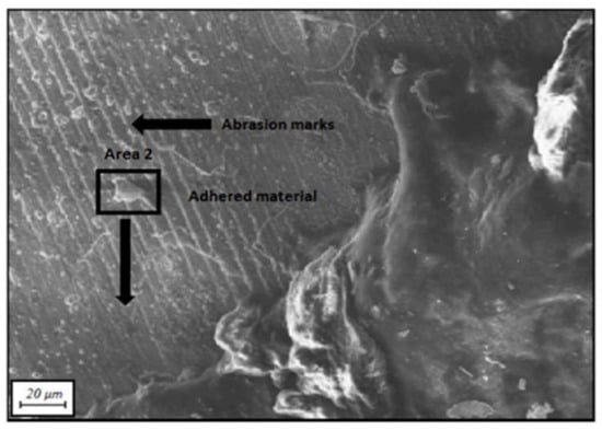 From Figure 12 and Figure 13, it can be observed that the wear sustained by Coating 1 is more intense than that of Coating 2, the former presenting more cracking and spalling than the other coating. There is, however, material (titanium) adhesion on both the tool coatings. The sustained flank wear over the cutting length for both coatings was also analyzed. The authors determined that the wear was less intense on Coating 2. The wear behavior for both coatings can be observed in Figure 14.