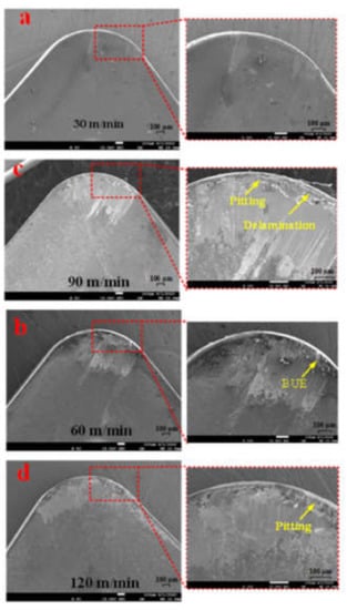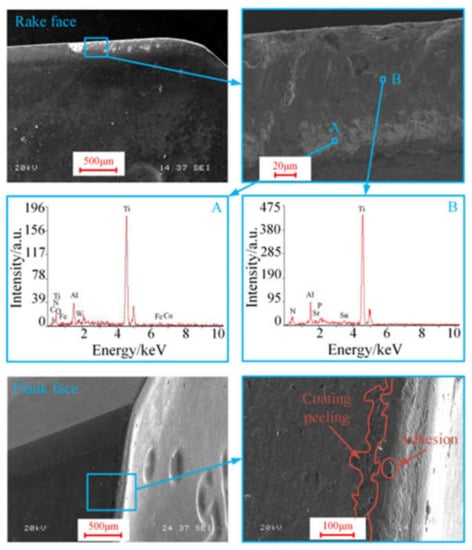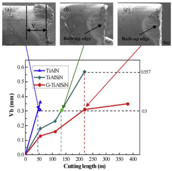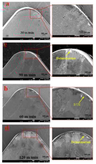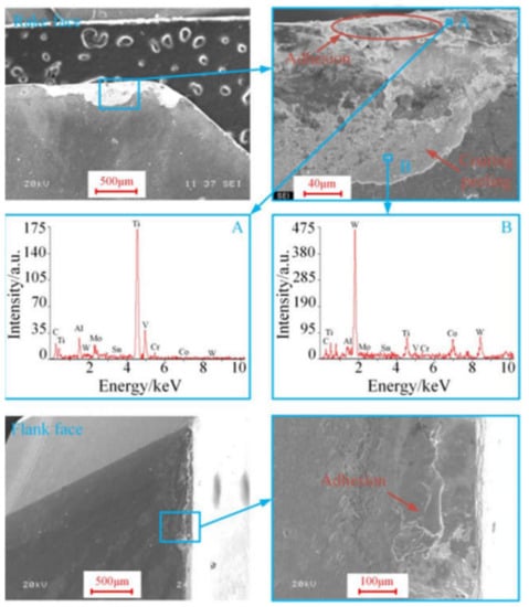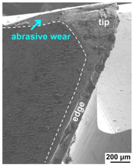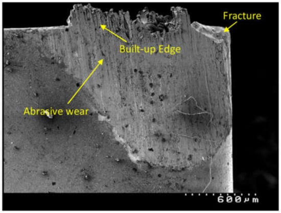 It was reported by the authors that in this case the main wear mechanism was adhesion and abrasion, for all the cutting conditions, these effects being attenuated by the employment of flooded and cryogenic cutting conditions, especially for the TiN coating. The TiN-coated tool suffered more adhesive and abrasive wear than the TiAlN-coated tool, this can be explained by the Al contained in the coating. This element can confer the coating with better thermal properties, explaining the fact that these are less affected by the temperature dependent adhesive wear. Still regarding the wear analysis of TiAlN-based coatings, Siwawut et al. [71] evaluated the cutting performance and wear characteristics of TiAlSiN and CrTiAlSiN coatings. These coatings were deposited by filtered cathodic arc onto WC (Tungsten Carbide) inserts. The authors tested the coated tools and one uncoated tool in the dry milling of cast iron turbine housings, using a range of 14–300 m/min for cutting speed. Coating’s mechanical properties were evaluated, namely hardness and Young’s Modulus values. The TiAlSiN coating exhibited the highest hardness value of all tools and the highest Young’s Modulus value of both the coated tools, although these values have been very similar to those of the CrTiAlSiN. This produced a higher surface finish quality when using the CrTiAlSiN-coated tool when compared to the CrTiAlSiN coated tool. The H/E ratio of these coatings was also evaluated, as this ratio is strongly correlated with wear performance. The CrTiAlSiN coating exhibited the highest value of all tools (0.112), being followed by the TiAlSiN coating (0.105). The insert wear was analyzed using SEM, whose images can be observed in Figure 10 and Figure 11.