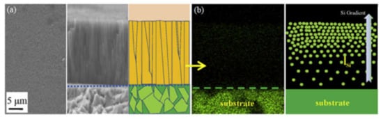 Another study performed by Zhao et al. [80], studies the cutting behavior of AlTiN coatings on the turning of Inconel 718 at cutting speeds of 40, 80 and 120 m/min. Machining temperature and cutting forces were evaluated and compared to an uncoated tool. These factors both decreased when using the AlTiN coated tool, proving that this coating is suited for the turning of these alloys. Similar to the studies presented in [78,79], the main wear mechanism suffered by the tools during machining was abrasive wear. Both the TiAlN and AlTiN coatings proved to be very useful when machining hard-to-machine materials, effectively reducing cutting force and machining temperature values. These values are tied to wear rate, with the coated tools exhibiting a significantly lower wear rate than uncoated turning tools [81]. The addition of Si to TiAlN coatings is known to significantly improve their mechanical properties [71], thus making these types of coatings ideal for the machining of materials such as titanium alloys. Lu et al. [82] compares the performance of TiAlN and TiAlSiN-coated tools in the high-speed turning of TC4 titanium alloy. The authors also studied the performance of a gradient TiAlSiN coating. The microstructures of these coatings and the distribution of Si on the gradient coating can be observed in Figure 19 and Figure 20.