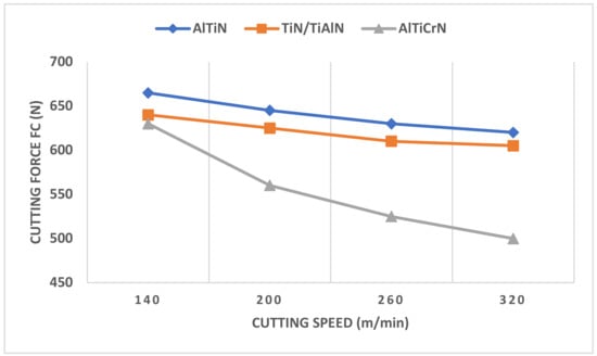 Cutting force variation (N) for different cutting speed values, for TiN and TiAlN-coated tools under the three different machining conditions, presented by Ravi et al. [70].