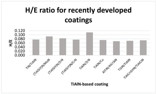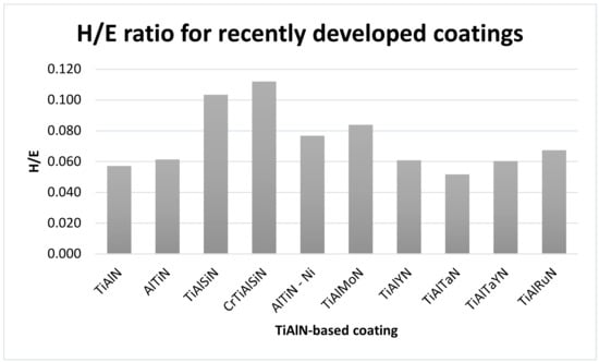Another element related to a significant increase in mechanical properties is Silicon (Si), significantly increasing hardness and Young’s Modulus values. TiAlSiN is an example of a TiAlN coating doped with Si. As seen in [65], TiAlSiN coatings have better mechanical properties and wear behavior when compared to TiAlN coatings.