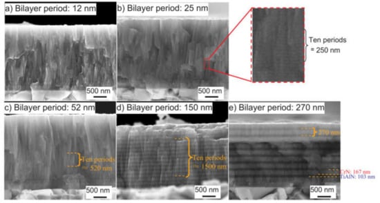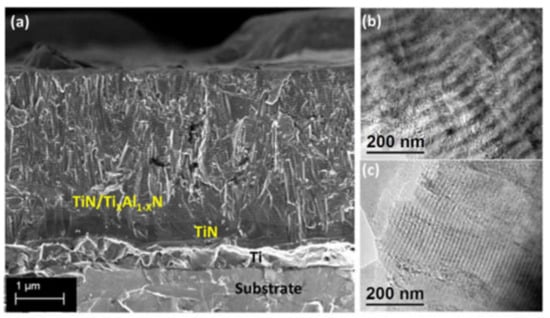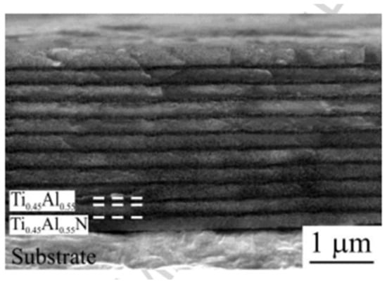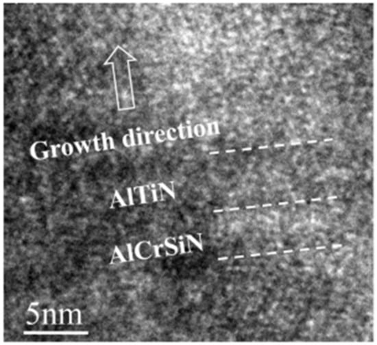 - Sun, P.L.; Hsu, C.H.; Liu, H.S.; Su, C.Y.; Lin, C.K. Analysis on microstructure and characteristics of TiAlN/CrN nano-multilayer films deposited by cathodic arc deposition. Thin Solid Films 2010, 518, 7519–7522. [Google Scholar] [CrossRef]