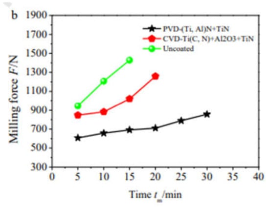The milling process has a huge presence in the machining industry, with many studies being conducted about the improvement of this process, either by using new tool geometries, coatings or by employing optimization techniques, such as the Taguchi method [43,69] to optimize machining parameters. TiAlN-based coatings are also being researched, in order to try and improve the various machining processes where they are employed. As seen in the beginning of this section, using doping elements to improve the coating’s mechanical properties [59,60,61,62,63,64]. Other approaches to improve the performance of these coatings involve the study of coating behavior under experimental machining conditions, or the study of the wear mechanisms sustained by these coatings during machining [39,43]. Ravi et al. [70] studied the influence of various lubrication methods on TiN and TiAlN-coated tool’s performance. The authors conducted milling experiments under, dry, flooded and cryogenic (liquid nitrogen) conditions. Furthermore, the tests were conducted at 75, 100 and 125 m/min of cutting speed. The cutting temperature and cutting force variation were evaluated for all tools. It was observed that the use of the TiAlN-coated tool over the TiN caused an increase in cutting performance, exhibiting a reduction of approximately 13% in cutting force for all cutting conditions. Moreover, the cutting temperature was 18% lower for the TiAlN-coated tools when compared to TiN. Cutting temperature increased with higher cutting speed values, however, cutting force values decrease for higher cutting speeds. This was particularly evident for the cryogenic cutting conditions, where the TiAlN-coated tools benefited greatly from this, exhibiting the lower cutting force value of all tools for all cutting conditions. This force variation for all coated tools under the three lubrication conditions can be observed in Figure 9.