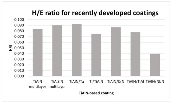 Hardness and Young’s Modulus values determined for TiAlN coatings (Coating 1 and 2), presented by Hoy et al. [72].