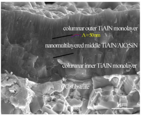 Layers can also be added to improve adhesion properties, enabling that the deposition of the outer layer, usually the “work” layer, with high adhesive strength. Usually this is done when the outer layer has problems with adhesion to the substrate. Coatings are also characterized by their chemical composition. The elements that constitute the coating confer it with different properties, as certain elements can improve properties such as, corrosion resistance, wear resistance and even thermal conductivity. For example, the first coatings (TiN) were improved by the addition of aluminum, creating the TiAlN coating. This coating proved itself to be very useful in high-speed machining application, being widely employed in many machining applications to this day, because they present an oxide layer created between the tool–workpiece interface, thus conferring this coating with high oxidation resistance [54,55,56,57]. Still regarding coating characterization, these are also characterized by their microstructure. Different coatings have different types of microstructure, depending on the deposition method, composition and their architecture, as described in the paper developed by Du et al. [58], where the effect of interlayers of Cr and Ti on the structure of TiAlN based coatings is studied. The authors deposited four types of coatings onto cemented carbide substrates, these being Cr/(Ti,Si,Al)N; Ti/(Ti,Si,Al)N; Cr/TiAlN; and Ti/TiAlN. It was found that the presence of these interlayers influenced the microstructure of the coatings. The Cr interlayer affects the growth of TiAlN based coatings, with the structure of the coatings containing this interlayer exhibiting a mix between columnar crystal morphology and equiaxed crystal morphology. In the case of Ti interlayer, the morphology was columnar. The Cr interlayer also promoted a better adhesion of the TiAlN based coatings onto it.