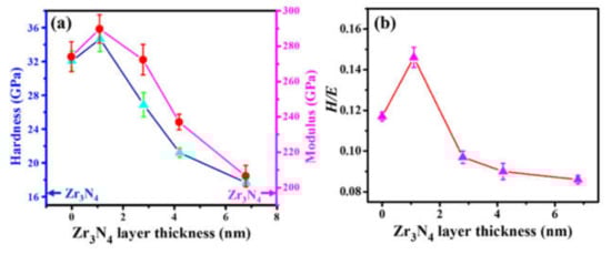 - Wang, L.P.; Qi, J.L.; Cao, Y.Q.; Zhang, K.; Zhang, Y.; Hao, J.; Ren, P.; Wen, M. N-rich Zr3N4 nanolayers-dependent superhard effect and fracture behavior in TiAlN/Zr3N4 nanomultilayer films. Ceram. Inter. 2020, 46, 19111–19120. [Google Scholar] [CrossRef]