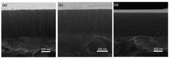 Still regarding the addition of elements to TiAlN-based coatings, in the study carried out by Liu et al. [62], the addition of Ruthenium (Ru) to TiAlN coatings is performed and evaluated. The authors compared the microstructures of base TiAlN coating and two other coatings with differing Ru contents—7% and 15%, respectively. As seen in the work presented above [61], it was noted that the Ru addition promoted a change in the coating’s microstructure, and similar to the addition of Ni, it promoted a homogenization of the microstructure. By analyzing Figure 8, the microstructure changes from a columnar structure to a homogenous structure.