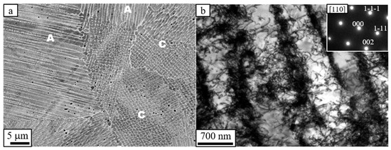 Microstructure of as-printed L-PBF-Inconel 718. (a) SEM electron backscatter image showing cellular and columnar subgrains. The labels A and C indicate columnar and cellular subgrains, respectively. (b) TEM bright field image showing entangled high-density dislocations along the columnar subgrain boundaries. The inset is a selected area diffraction (SAD) pattern.