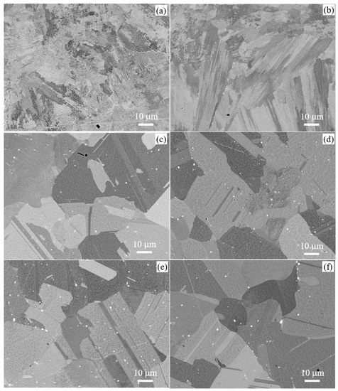 SEM electron backscatter images: (a) as-printed, (b) ST1 (1100 °C/1 h), (c) ST3 (1100 °C/3 h), (d) ST6 (1100 °C/6 h), (e) ST9 (1100 °C/9 h) and (f) ST16 (1100 °C/16 h). The white spots in the images are carbides (mainly NbC) particles; the darker spots are most likely TiN or Al-rich particles, depending on the morphology. Al-rich particles are usually circular in shape (note that all the images were recorded at the same magnification).