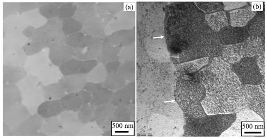 The formation of subgrains in L-PBF-Inconel 718 is believed to be a consequence of the local thermal cycles that occurred during printing. Due to the layer-by-layer fabrication of the material, each of the deposited layers experiences rapid heating and cooling cycles that build up residual stresses in the material. The formation mechanism of residual stress in AM materials was explained by Mercelis and Kruth [20] using a cool-down phase model. It is indicated that part of the previously melted material experiences remelting and re-solidification cycles. After re-solidification of the material, the cooling-down cycle leads to material shrinkage, which is partially restrained by the previously deposited material. The process then forms a stress state in the newly deposited material. The resulting high strains normally leads to the emergence of high-density dislocations, which are proportional to the amount of stresses. Under the prevailing stresses, the dislocations tend to organize themselves into low-energy states that form walls of dislocations inside a given grain. These walls of dislocation thus divide the grains into sections that differ from each other by low angle misorientation to form subgrains. The dislocations are also entangled around the Laves particles formed by segregation of heavier elements, such as Nb, Mo, and Ti. Most of the dislocations are annihilated during the solid solution heat treatment and leave behind thinner subgrain boundaries than before as shown in Figure 3. As stated above, the 3 h hold time at 1100 °C of ST is not long enough to eliminate the entire subgrains. This substructure cannot be eliminated even after 7 h of ST as we reported previously [10,12]. On the other hand, we did not observe the remnants of the subgrains in the sample ST for 9 h after having examined multiples of TEM images. The complete elimination of the subgrains in L-PBF deposited Inconel 718 is thus believed to be between 7 and 9 h of ST at 1100 °C.
