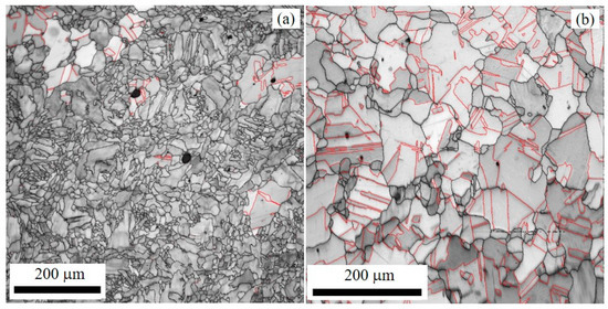 where Ltb is the total twin boundary length in each section of area A. The image quality (IQ) of the EBSD maps for two of the STA samples that exhibit grain boundaries and twin boundaries is shown in Figure 4. The twin boundaries are shown in red lines, whereas the black lines are for grain boundaries. The average grain size estimation is based on the histogram analysis data used by TSI/OIM software in the EBSD system. The average grain size, diameter (D), can be computed using Equation (2) [22]: