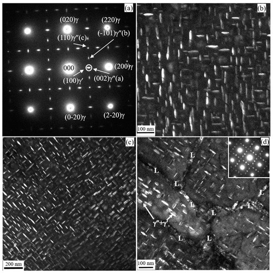 Typical TEM images that reveal details of the microstructure of the STA samples are shown in Figure 6. The SAD pattern shown in Figure 6a was recorded with the matrix oriented in the <001> zone axis. The strong spots in the diffraction pattern are reflections from the austenite (γ) matrix. The superimposed weaker spots are super lattice reflections of the γ″ and γ′ phases. Three variants of γ″ precipitate on the {100} planes from the superposition of the different patterns in the SAD. These variants are based on <100>γ″, <010>γ″, and <001>γ″ orientations. The dark field (DF) image of Figure 6b is from the {002}γ″ reflection in <100>γ″ and the {101}γ″ reflection in the <010>γ″ zone axis. Similarly, the DF images shown in Figure 6c,d were recorded from similar spots of the same SAD. The reflections from the γ′ precipitates (primitive cubic) overlapped with the γ (fcc) reflections. For the reasons explained in [5,26], only a few of the super lattice reflections are common to both γ″ and γ′ precipitates. In this case, the {100}γ′- and {002}γ″-type reflections in the <001>γ orientation are superimposed. The DF image obtained from the circled spot shown in Figure 6d belongs to the reflections from both precipitates. The two precipitates can then be distinguished from the DF image without ambiguity. The γ′ precipitates are spherical whereas the γ″ precipitates are mostly elliptical in morphology. The two phases sometimes fuse together and form a compact morphology. The white arrows in Figure 6d indicate examples of composite γ′ and γ″ precipitates. A large quantity of fused γ″ and γ′ is obtained after a longer aging time [27]. Detailed analysis is available in [12,26,28].