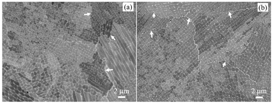 Electron backscatter SEM images: (a) as-printed and (b) direct-aged samples. The arrows are pointing to the grain boundaries in both images.