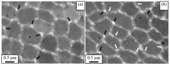 Aging temperature is generally not high enough to initiate recrystallization in L-PBF-Inconel 718 and its effects on grain growth are thus insignificant. The grain structure of the direct aged sample is qualitatively the same as that of the as-printed as shown in Figure 7. The sub grains and the segregated particles in the subgrain boundaries remain undissolved after aging. The white spots seen in both images are largely the Laves phase. There are, however, some slight differences in the microstructure between AP and DA based on the analysis of the high-magnification SEM images shown in Figure 8. The black arrows point to some of the bigger Laves particles located along the subgrain boundaries in both (a) for AP and (b) for DA. After aging, very fine and needle-like precipitates evolved from the segregated phases located along the subgrain and grain boundaries. The white arrows in Figure 8b indicate that some of these needle-like precipitates formed near/along the subgrain boundaries. The Laves phase, whose Nb concentration is high, appears as the nucleation site for the needle-like delta (δ) precipitates. The δ phase is an orthorhombic structure with the same formulation (Ni3Nb) as that of the γ″ phase. The precipitation of the δ-phase could start at relatively lower temperatures (700–900 °C) [7], but the optimum precipitation temperature is somewhere between 870 and 1010 °C [7,12]. Slama et. al. [8] also observed similar growth of the δ precipitates even at lower temperature (550 °C), but after a very long hold time (50 h). Nucleation of the δ phase requires 6–8 wt. % Nb [7], and it is therefore reasonable to observe δ precipitates in the subgrain boundaries than inside subgrains. The formation of δ can potentially reduce ductility and toughness due to its embrittlement nature [7] besides depleting Nb [8,29] that is otherwise consumed for precipitation of strengthening phases. Furthermore, the formation of δ particles weakens the creep strength of Inconel 718 in the elevated temperature test [30].